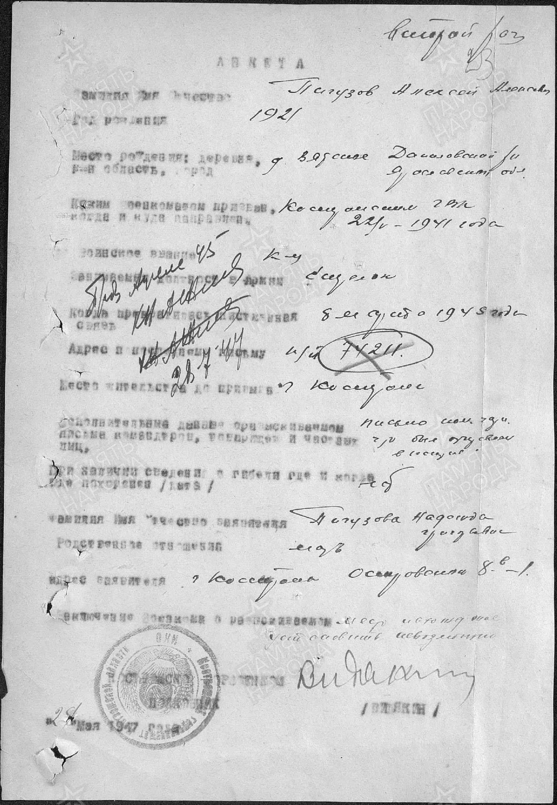Пигузов Алексей Алексеевич, год рождения: 1921