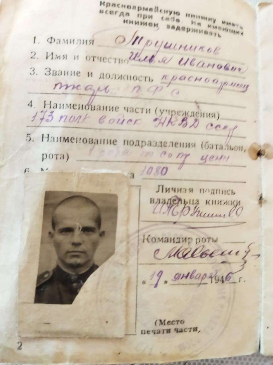 А что узнать хотите? Дата на книжке красноармейца январь 1946 года, с фронта вернулся, 173 полк НКВД Информацию о нем найдете в интернете.