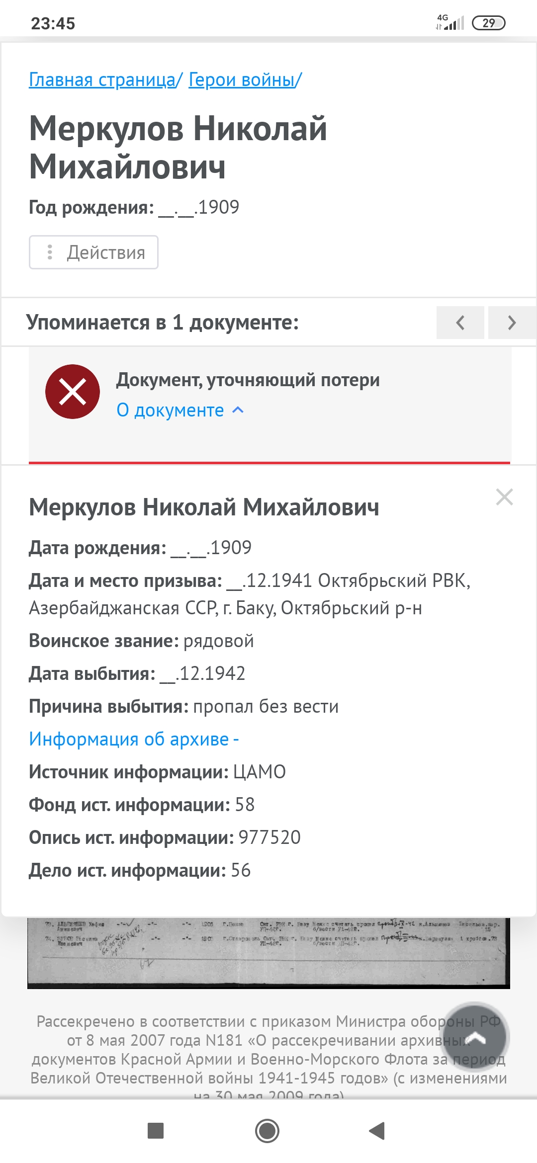 Меркулов Николай Михайлович род.в Баку Азербайдж.ССР 1909г.Призывался из Баку Октябрьского района РВК в декабре 1941г.А осенью 1942г.безвести пропал.Где воевал нет данных.Звпние Рядовой..мирная профессия ..шофер..Очень хочется узнать Где был последний бой.Буду всем благодарна за информацию. |