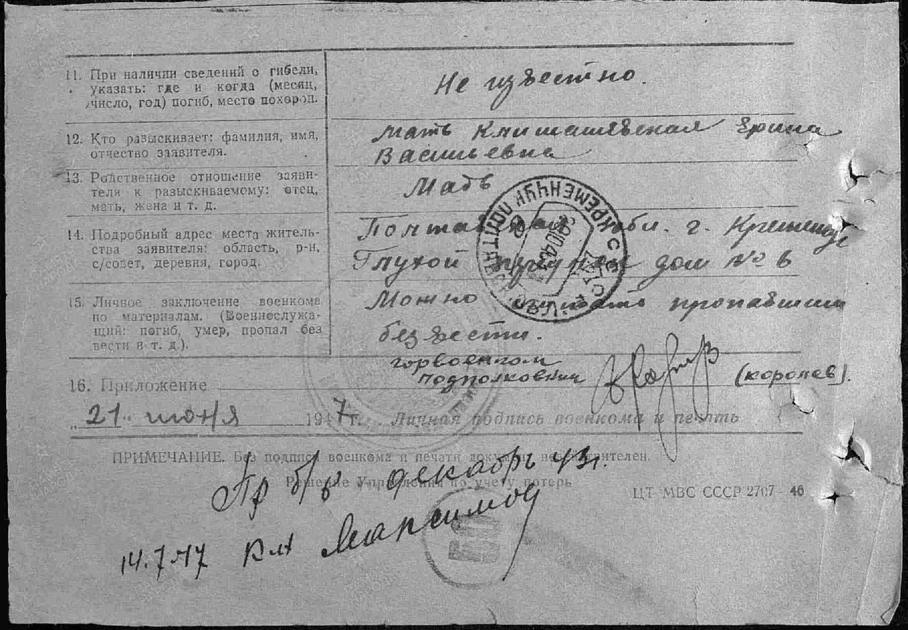 Помогите найти место захоронения Климашевского Василия Еремеевича 1922 г.р., Украина, Полтавская обл., г. Кременчуг, призыв 08.1941, пропал без вести в 1942-43 гг.