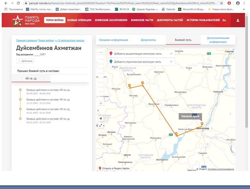 | Здравствуйте, надеюсь на вашу помощь в поиске место захоронения пропавшего деда по линии отца. Дуйсембинов Ахметжан. Призывался КАЗ.ССР.Павлодарской обл.Лебяжинский р-н Бескарагайский племхоз ,так указано в документах ЦАМО.Дата рождения1897-1899.Дата призыва 1941.Лебяжинский РВК.Павлодарской обл.КАЗ.ССР.Воинское звание красноармеец.Дата выбытия03.01.1943.Причина выбытия -пропал без вести.Считался без вести пропавшим в ОБД МеМОРИАЛ-1899г.р