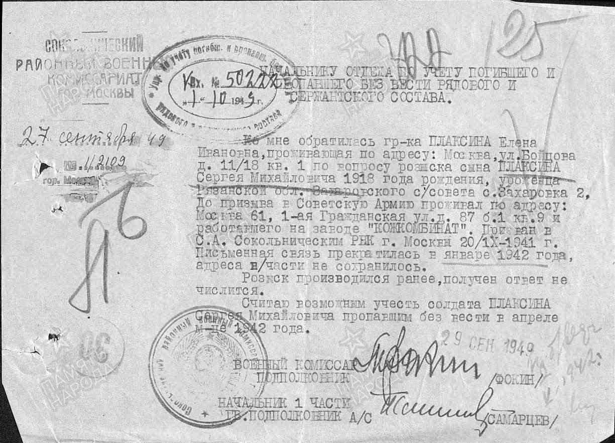 Пожалуйста, помогите найти информацию по Плаксину С. М. 1918г.р., пропал безвести в апреле 1942г.