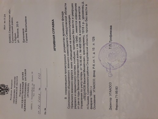 1918 г.р., уроженец д. Н-пышма, Сухоложского р-на, Свердловской обл.