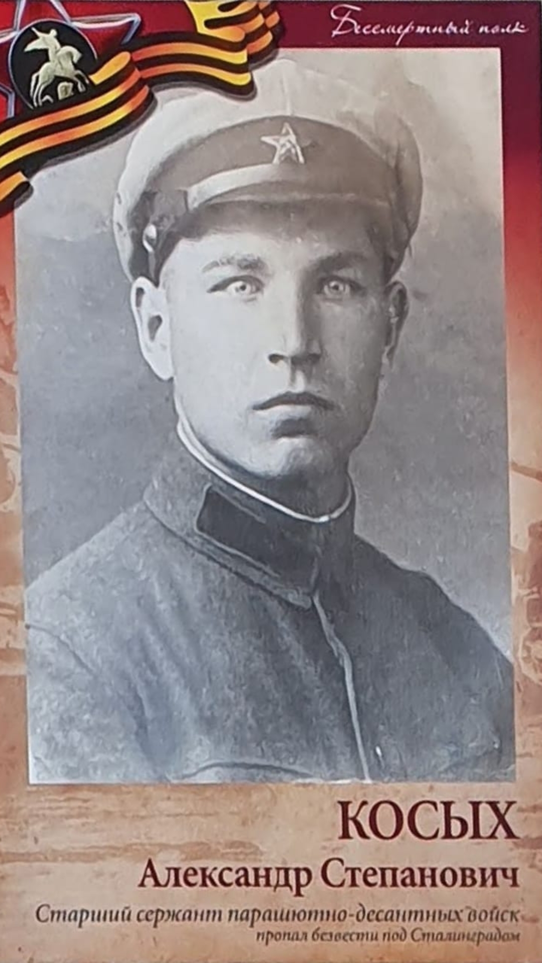 | Добрый день. Помогите, пожалуйста, в поиске моего деда Косых Александра Степановича, дата рождения 31.07.1912г. Был призван 18.10.1941г Оричевским РВК Кировской области. Сержант, командир отделения.последнее письмо 07.08.42г, место службы пп ст.1909-в, 4 батальон, 11 рота. Пропал без вести октябрь 1942г.Был в учебке в Ногинске, письма оттуда от марта и июля 1942г. |