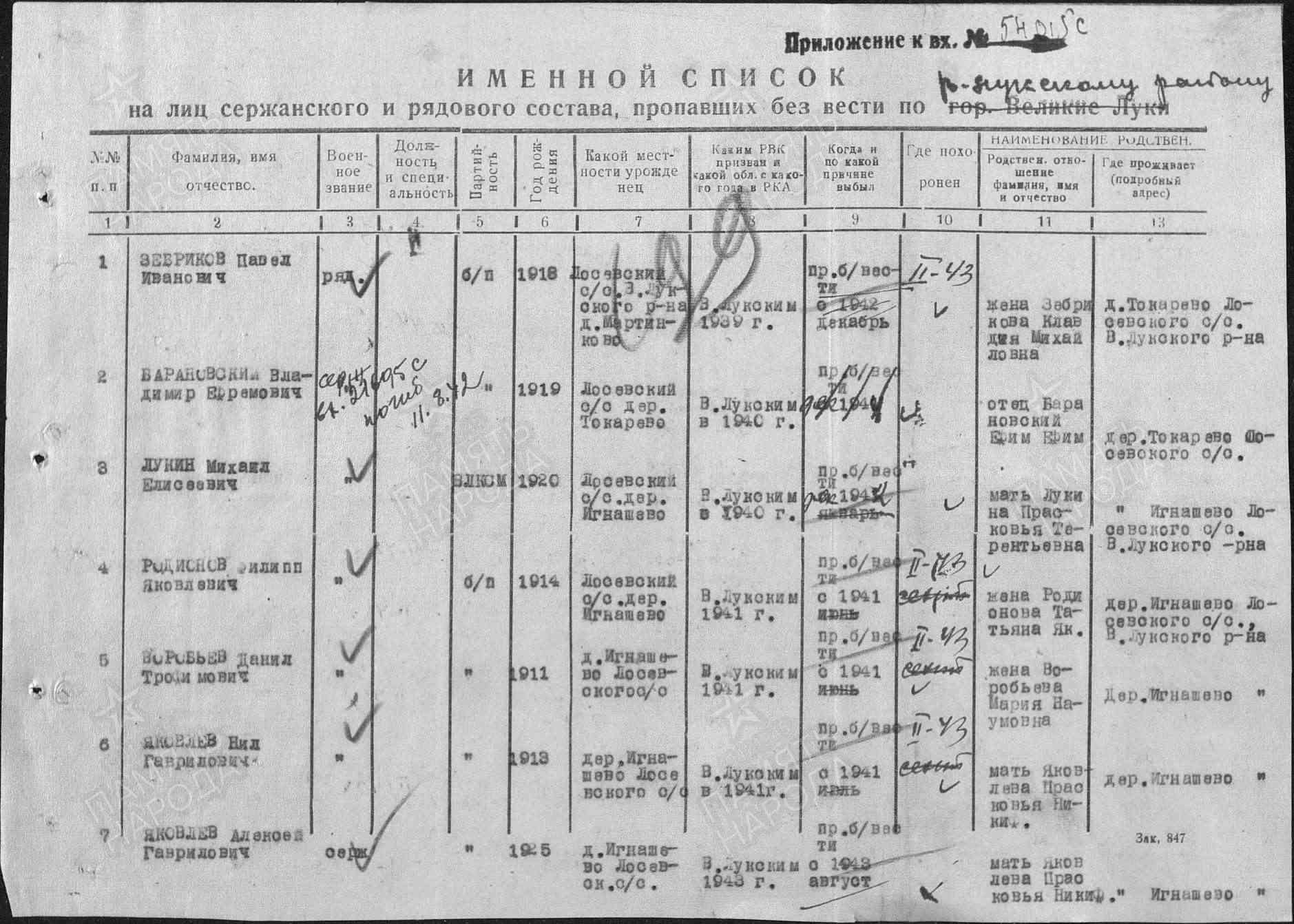 | Ищу данные о месте гибели и захоронения или какую нибудь дополнительную информацию о моем дедушке! Фамилия Зебриков Имя Павел Отчество Иванович Дата рождения/Возраст 1918 Место рождения Великолукский р-н, Лосевский с/с, д. Мартинково Дата и место призыва 1939 Великолукский РВК, Великолукская обл., Великолукский р-н Воинское звание рядовой Женат - Зебрикова Клавдия Михайловна мать- Дарья Марковна Причина выбытия пропал без вести Дата выбытия -02.1943 Название источника донесения ЦАМО Номер фонда источника информации 58 Номер описи источника информации 18004 Номер дела источника информации 211
