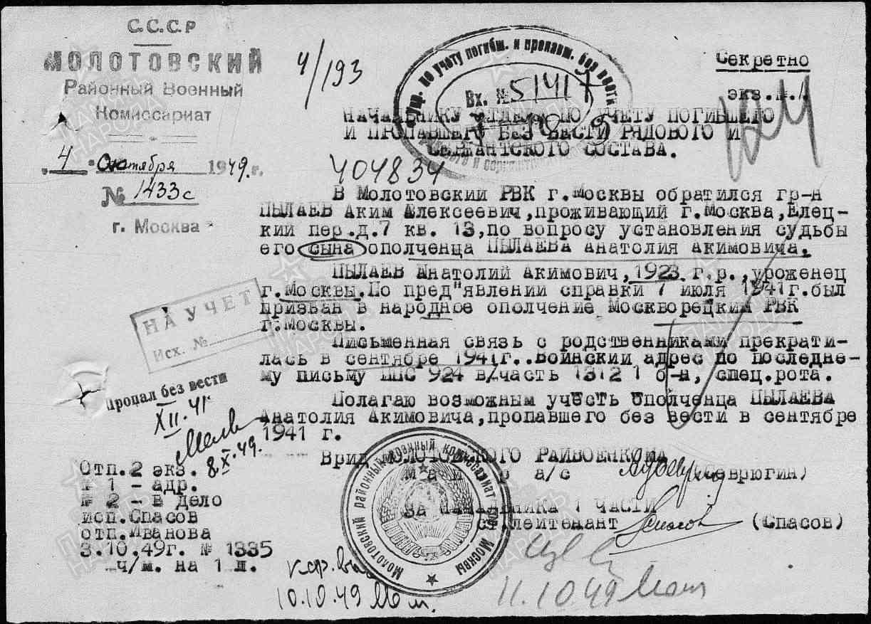 | Пожалуйста, помогите найти возможное место захоронения моего родственника Пылева Анатолия Акимовича, 1923 гр. В документах в его фамилии оказалась ошибка - он был записан как Пылаев. Родился в Москве, был призван в народное ополчение в Москве 7 июля 1941г, Москворецкий РВК. Письменная связь с родственниками прекратилась в сентябре 1941 г. Воинская часть по последнему письму ППС 924, в/часть 1312, 1 батальон, спецрота. Был признан пропавшим без вести. Его родители: Пылева Анна Андреевна, Пылев Аким Алексеевич. Его искали с войны, но безрезультатно. |