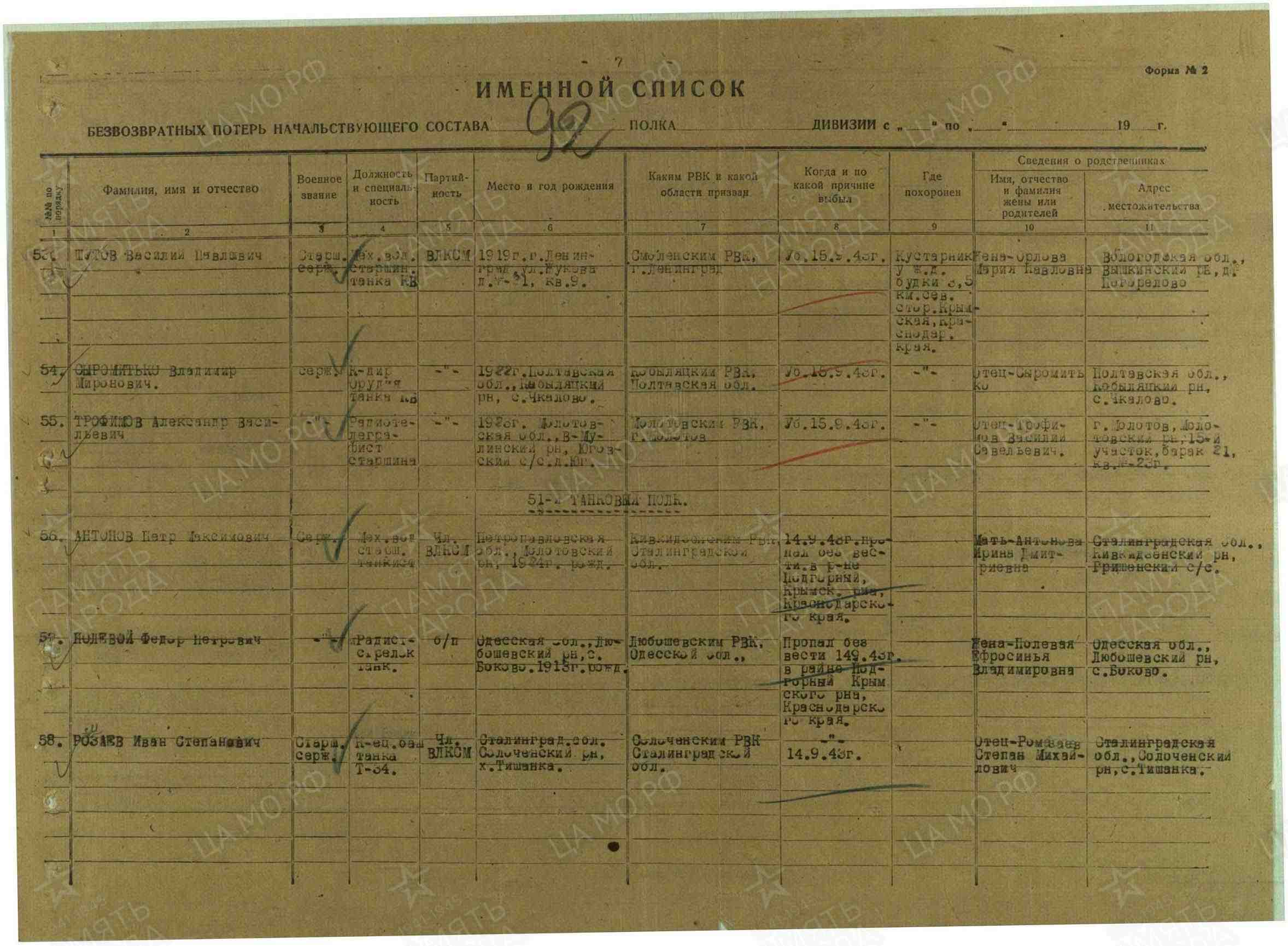 | Добрый день. Помогите найти без вести пропавшего родственника : Антонова Петра Максимовича (пропал без вести 14 09.1943 г.) Дата рождения: 1924г. Место призыва : Сталинградская область, Киквидзенский район, Гришинский с/с. Мать : Антонова Ирина Дмитриевна Отец : Антонов Максим Антонович (пропал без вести в 1943 г.) Звание : сержант Специальность : мех.вод.старш.танкист |