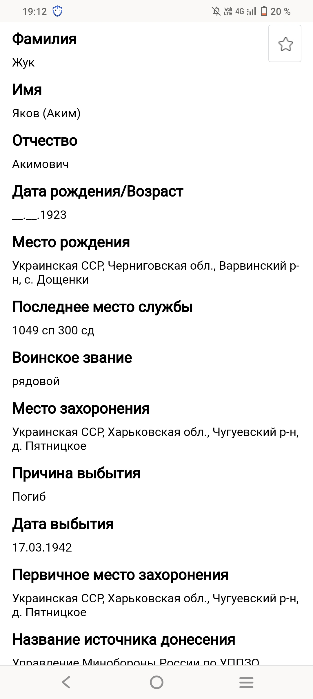 Доброго времени суток. У меня немного нестандартная просьба. Дело в том,что мы на днях узнали наконец то где захоронен мой прадедушка,в архиве указанно место:Украиское Сср, Харьковская область, Чугуевский р-н,Пятницкое. Возможно кто то может попасть на то захоронение и найти его могилу,или если это братская могила,что скорее всего так и есть,возможно сфотографировать табличку мемориала с его именем. Нашей бабушке мы пока не сообщили не проверив информацию,недавно от инсульта только отходить начала и не хочу зря расстраивать.Прилогаю фото с информацией,это все,что было в архивах и до недавнего времени и этих данных не было. Буду очень благодарна любой помощи,возможно кто то из ваших родственников с ним воевал,хоть и вряд-ли,но опять же буду рада любой весточке и ответу от вас. Спасибо за внимание. |