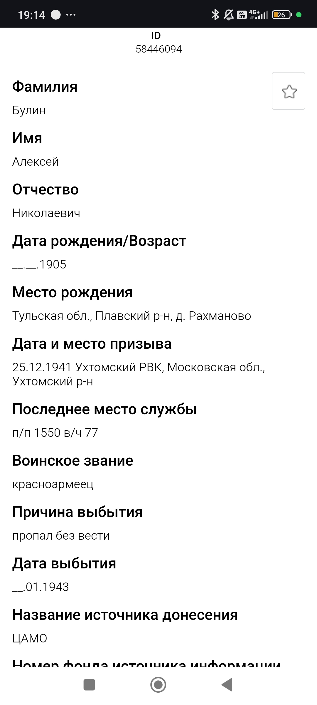 | Булин Алексей Николаевич 1905г.р. Место рождения: Тульская область, Плавский район, д. Рахманово. Жена:Булина Мария Ивановна, проживали по адресу:Московская обл., гор. Люберцы, Октябрьский проспект , д.217 (место жительство его родных моей бабушки его дочки изменилось)25.12.1941г. был призван на службу Ухтомским РВК по Московской области. Последнее место службы: п/п 1550 в/ч 77,353 курсантский запасной полк. С января 1943г. считается безвести пропавшим. И до сих пор никакой информации о нем нету. Папа ходил в военкомат но там никакой информации нет. |