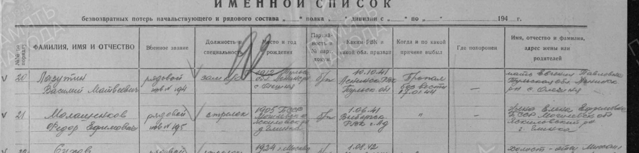| Добрый день! Ранее уже обращался по поводу поиска своего прадедушки-код запроса 14991. По всем данным, прадедушка Малашенко Феофан Ермолаевич 1905 года рождения, числится пропавшим без вести. Но совершенно случайно, в данных и о другом человеке, обнаружил запись в «донесениях о безвозвратных потерях», где совсем другие ФИО, но номер извещения и фамилия жены, идентичны запросу на моего прадедушку. У прабабушки другое имя и отчество. У прадедушки и человека, который записан в журнале - схожие, но не одинаковые фамилии, ИО -отличаются |