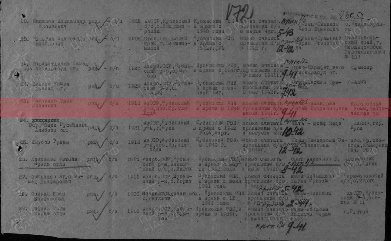 Был призван в 1939 году Кубинским РВК, Азербайджанской ССР, Кубинским р-н. Пропал без вести в 1941 году в июне.