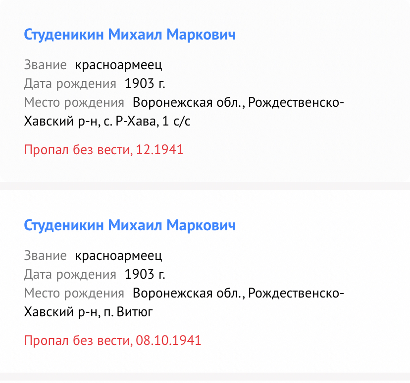 | Студеникин Михаил Маркович 1903гр. Красноармеец. Место рождения: Воронежская область. Рождественская Хава, пропал без вести. Призван в августе 1941г. Выбыл в декабре 1941г. Жена: студеникина варвара михайловна. Справка из военкомата. Больше никакой информации. Писем нет и не отправлялись. Является моим прадедушкой. Очень рассчитываю на Вашу помощь. Спасибо. |