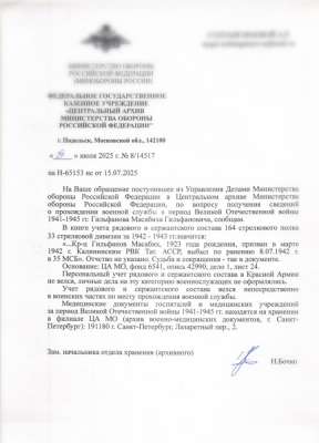 Здравствуйте, спасибо большое за ваш ответ! Я 3-ды обращалась ВАМИ(по адресу г. Подольск, Московская область, 142100) На первое обращение получила ответ(по поводу прохождения дедушки военной службы 164 сп 33сд) После получения мед.справки(ранение, операция, после госпиталя куда он выбыл(в/ч:1073 сп) Второй раз обратилась в ЦАМИ(по адресу г. Подольск..) Ответа не получила, в декабре 2025г.дублировала своё обращение.. Все ещё жду ответа.. На сайте"Подвиг Народа"1000страниц с фамилиями Гильфанов-Гильманов(всех их просмотрела), искала информацию в отчетных данных боевых действии 8гвард.стрел.дивизии(1941-1942г), книги Бауржан Момыш улы прочитала(там есть данные только до февраля 1942г), на страницах"Форум поисковых движении:8 гвардейская стрелковая дивизия":есть сведения боевых действии этой дивизии. Админу этой страницы я тоже обращалась, мне ответили:скорее всего 1073 сп упомянут как ПМП..