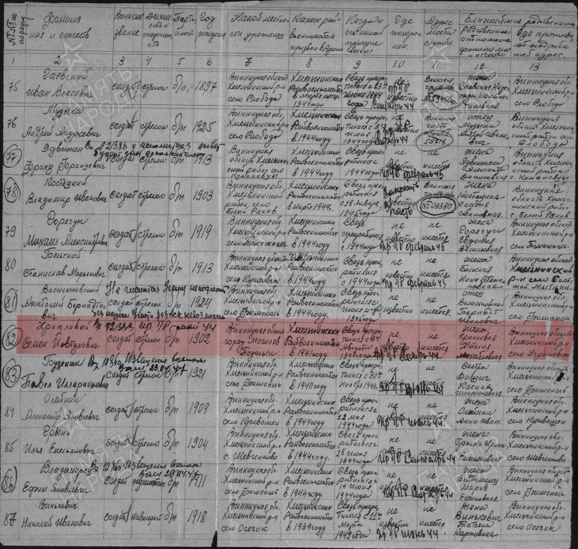 | Ищу прапрадеда Хрипливый Семен(фамилия настоящая неизвестна во всех последних документах значится Хрипливым).Родился в 1902 году, предпожительное место точно неизвестно в документе значится Винницкая область г. Могилев-Подольск, был поляком из рассказов, мобилизован из Хмельницкого района в 1941 году, связь потеряна в августе 1944 года(пропал без вести), был стрелком. Жена Хрипливая Наталия Михайловна. Самая младшая дочь была Хрипливая Тая Семеоновна. Будет хорошо даже если найдутся просто родственники т.к. связь с большинством потеряна. |