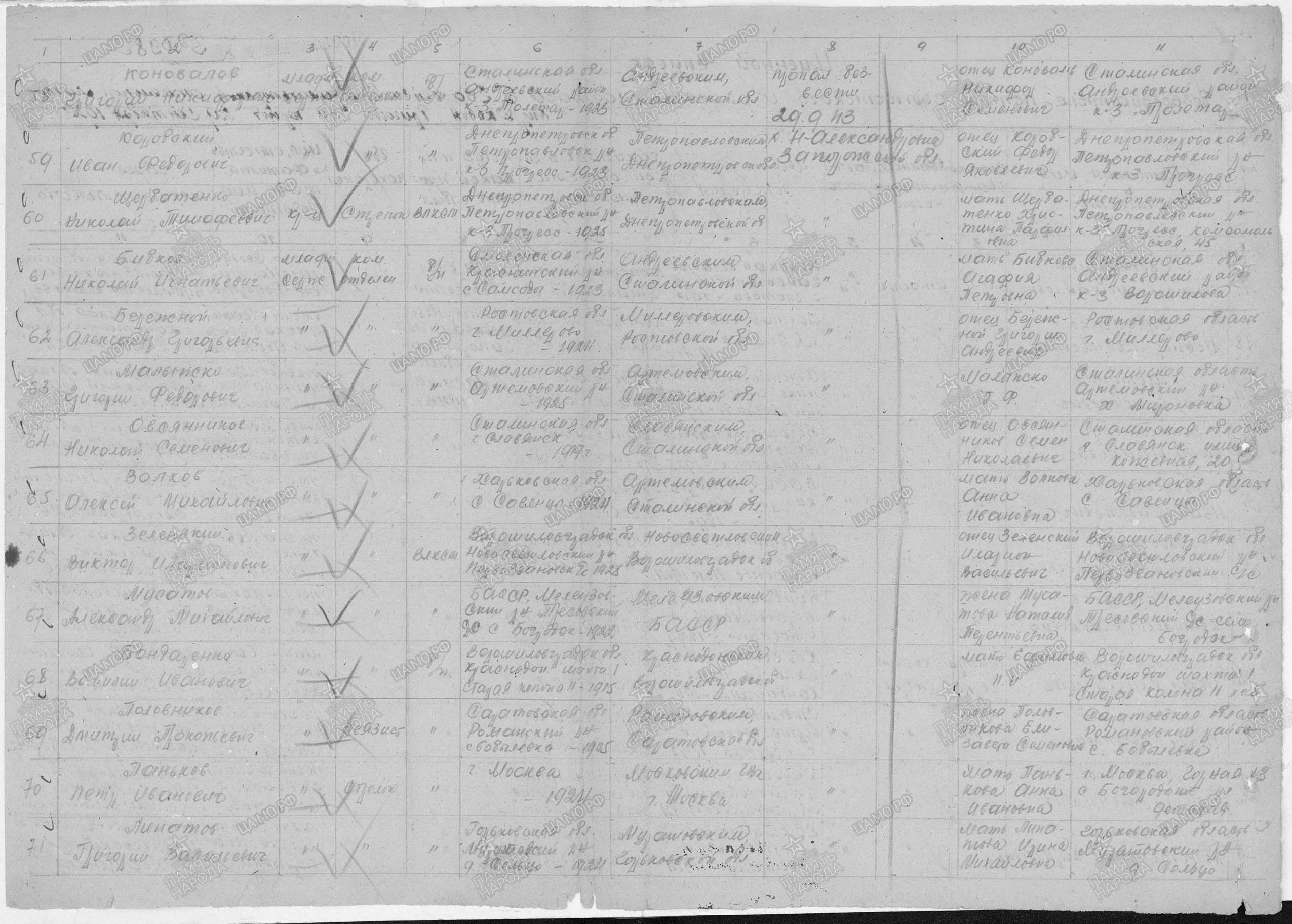 В ЗАПРОСЕ, КРОМЕ Ф.И.О., УКАЖИТЕ ДАТУ и МЕСТО РОЖДЕНИЯ, ДАТУ и МЕСТО ПРИЗЫВА, А ТАКЖЕ ИМЕНА МАТЕРИ ИЛИ ЖЕНЫ.