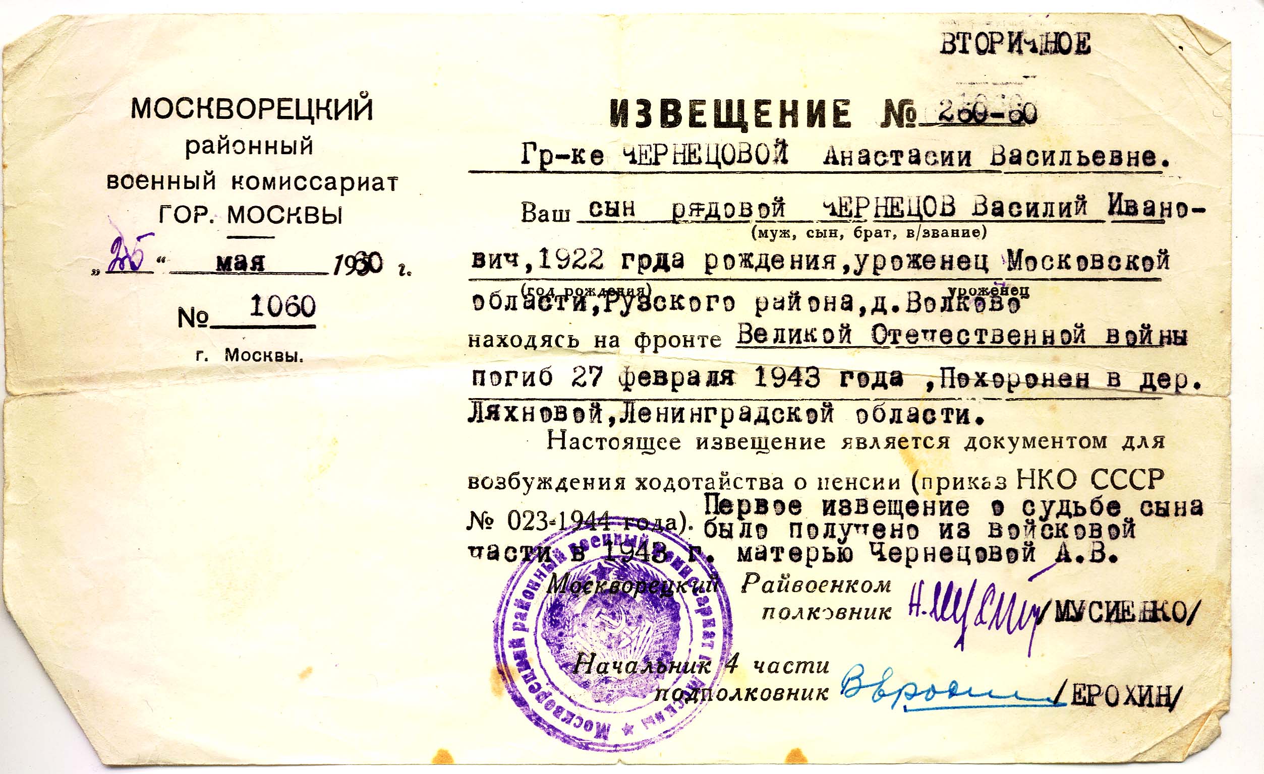 Здравствуйте! Спасибо БД Мемориал - проведена ОГРОМНАЯ РАБОТА, я нашла своего деда Артюхова Николая Хрисановича (Кресановича) 1906 г.рождения, призван Верхнегрунским военкоматом Курской обл.в 1941 г. Умер от ран в 1943г. Похоронен близ деревни Журавлевка Курской обл. В документах указана его жена А...