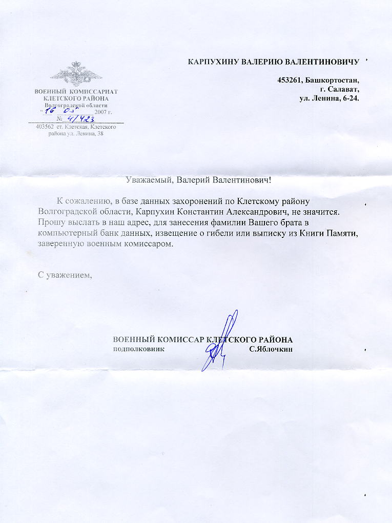Здесь дают рекомендации по установлению судьбы ПРОПАВШЕГО БЕЗ ВЕСТИ военнослужащего. Запросы другого характера, а также от анонимных авторов не рассматриваются и удаляются из системы. При появлении комментария автоматически приходит уведомление. Чтобы оставить запрос, требуется регистрация в ЛИЧНОМ КАБИНЕТЕ.