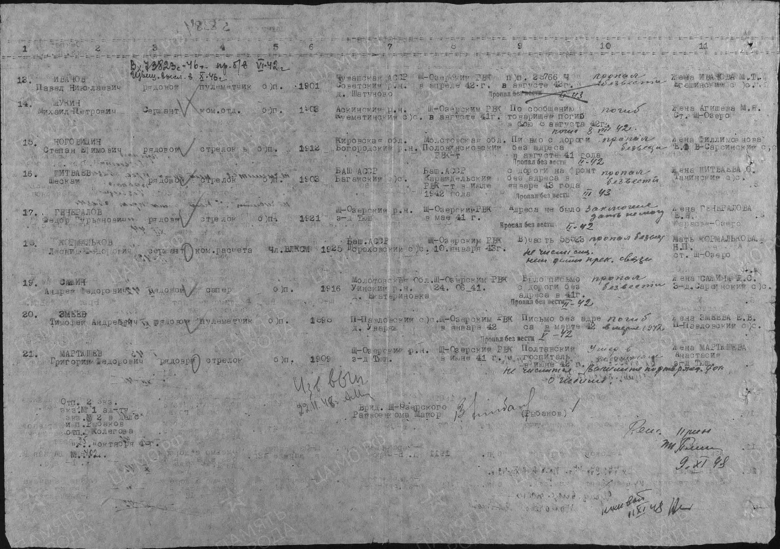Солдат, стрелок, беспартийный, родился 1919 году в Якутской АССР, Сунтарский район, II Жарханский наслег. Призван в 1942 году Нюрбинским ОРВК ЯАССР. Есть запись о том, что "Можно считать пропавшим без вести в 1944 г. Мадине?Мадиле? Название неразборчивое, буква "л" или &... |