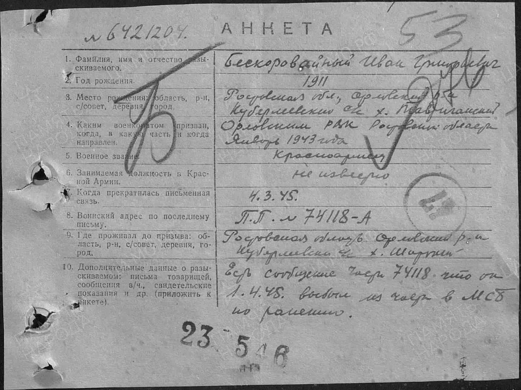 Помогите найти сведения о булгакове григории егоровиче, 1911гюрю призван 25.06.41г кирсановским РВК Тамбовской обл.. Прошел войну до 1944 года, а потом данные разнятся: то ли в апреле, то ли в июне пропал без вести, наверное были не очень грамотные и арабскую цифру 1У прочитали, как июнь ( это по о...