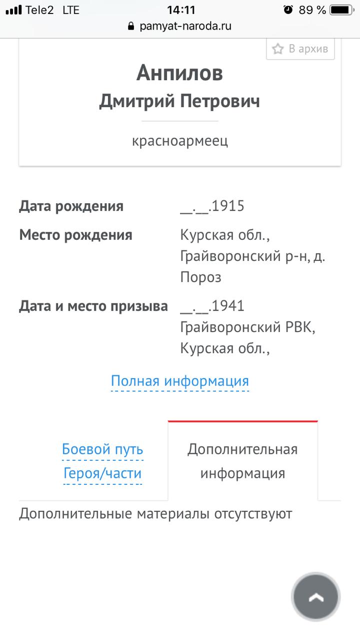Дата рождения __.__.1903 Место рождения Абакумовский с/с, с. И.-Лебедянка Дата и место призыва 28.10.1941 Токаревский РВК, Тамбовская обл., Токаревский р-н Посмотреть на карте Дата выбытия __.01.1942 Причина выбытия пропал без вести Помогите найти деда. Только приз... |