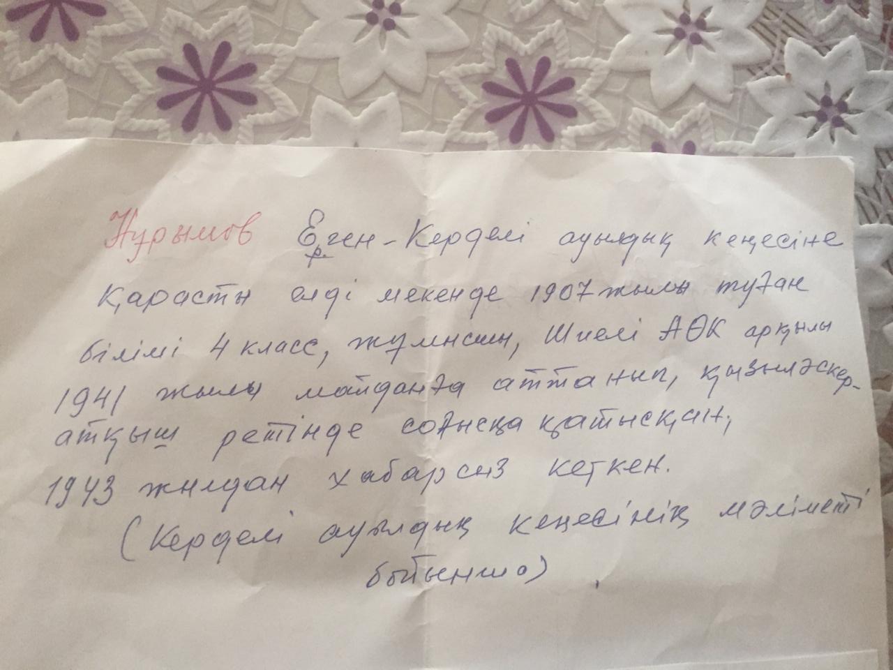 Сарсен(м)баев Ильяс 1902 или 1905 года рождения. Призван в 1942 году Терень-Узякским РВК, Кзыл-Ординской области, Терень-Узякского района, Казахской ССР. Коммунист, учитель. в последнем письме( к сожаленью, не сохранилось) написал, что воюет под Сталинградом. Пропал без вести в сентябре...