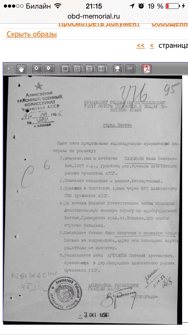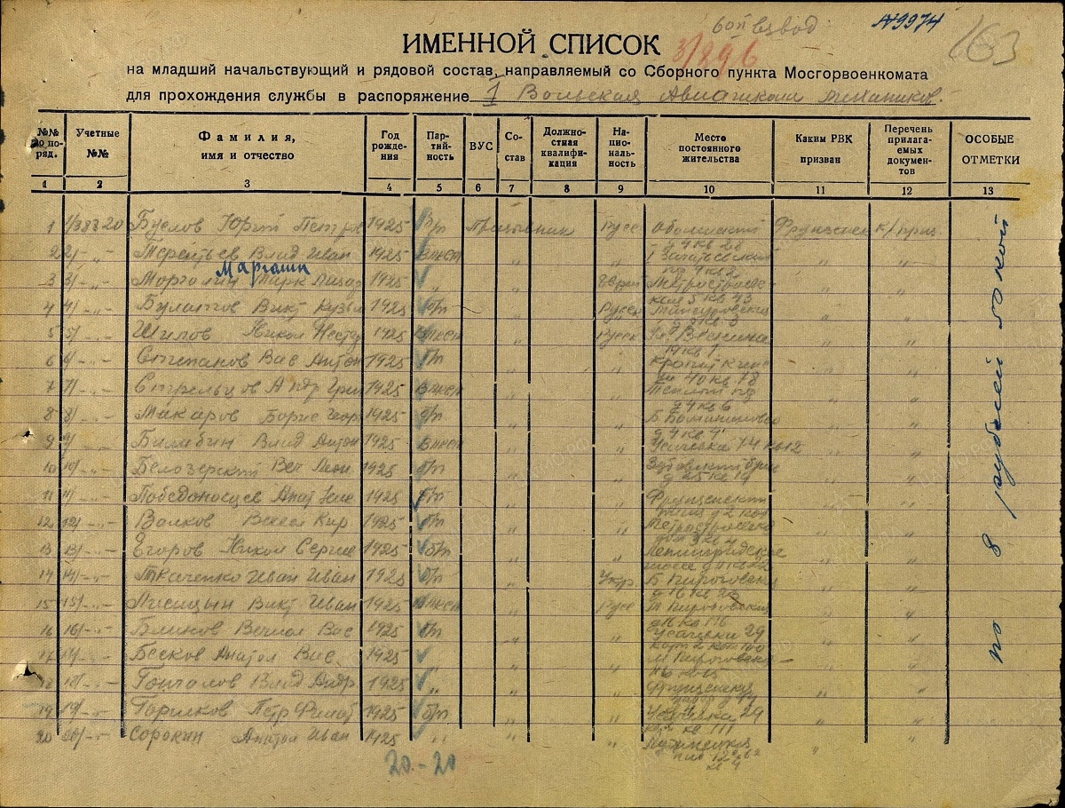 Дата рождения 19.03.1925г. Место призыва-Фрунзенский РВК . Военно-пересыльный пункт -СПП Московского ГВК. Куда выбыл - 1 Вольская ВАШАМ. ... |