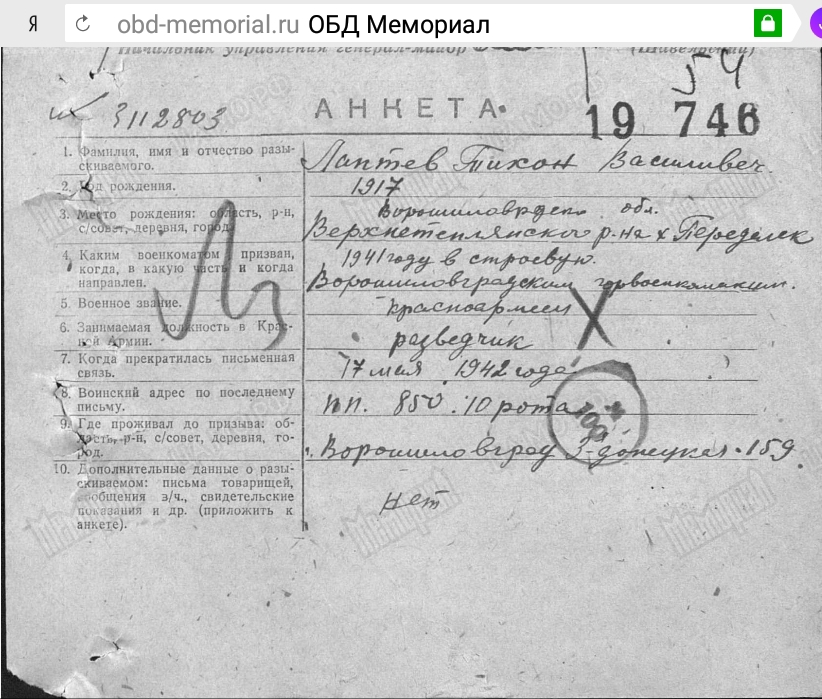 Добрый день! Спасибо огромное за Вашу работу! Я ранне оставляла запрос по поиску информации о моем прадедушки Панфилов Василий Дмитриевич 1907г.р. Спасибо, что не оставили без внимания мою просьбу и предоставили всю имеющуюся информацию Но сегодня опять каснулась этого воп... |