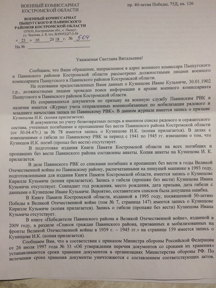 Помогите установить судьбу и место захоронения моего деда Кузнецова Ивана Кузьмича 1902 г.р. д.Кукшинга Павинского р-на Костромской области. Обращалась в РВК но там видимо ошибка или опечатка....