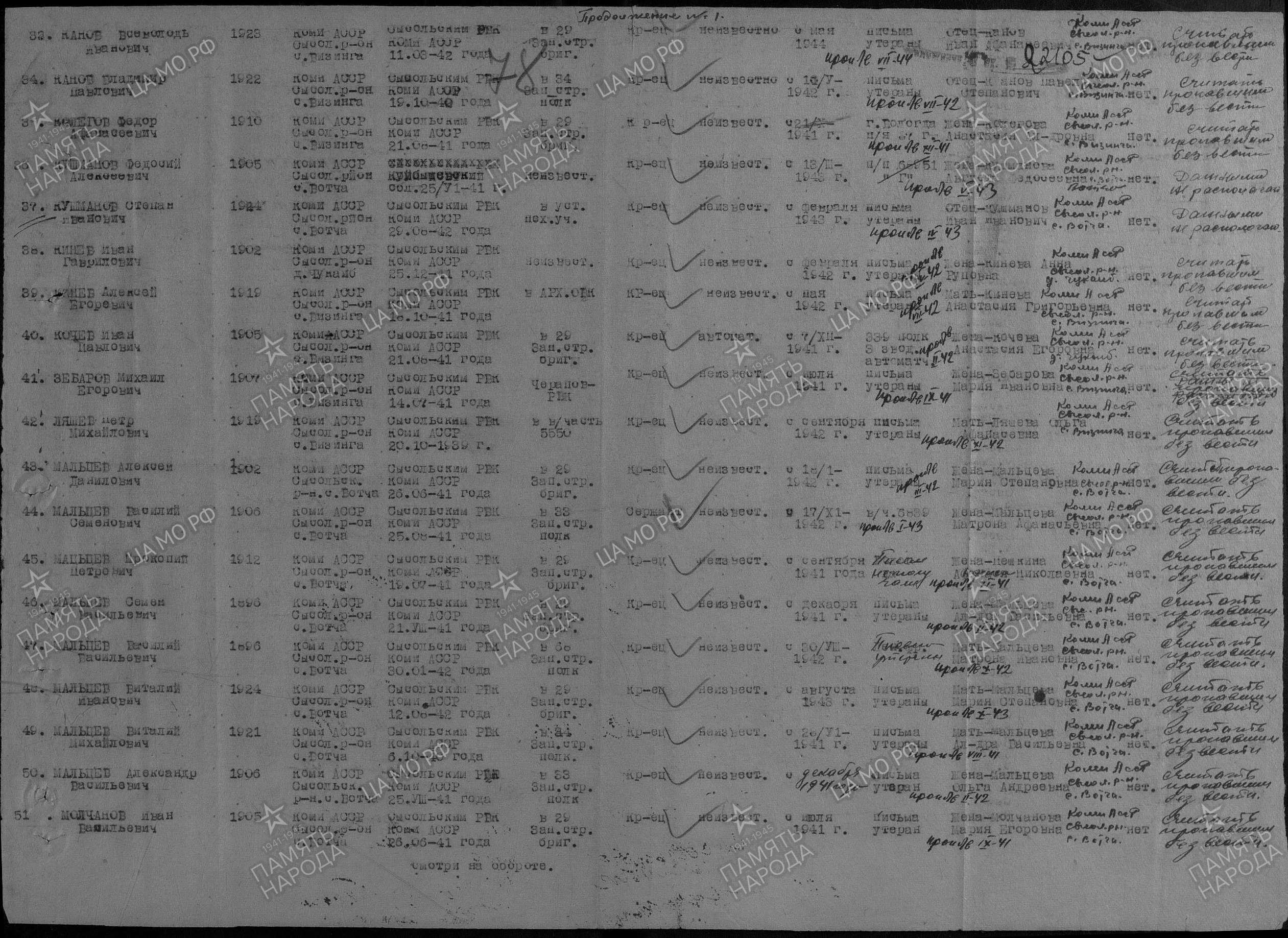 Мой дядя пропал без вести. Вот что известно:год рождения 1925, место рождения Карело-Финская ССр, дер.Горка. Призван из эвакуации 02.1943 Шаранский РВК Башкирской АССР. П/п 66542-т(6 отд), мл.сержант, конно-пулеметчик. В/ч 766 сп подчиненность 217 сд. Пропал без вести в августе 1943. Дед делал запр...