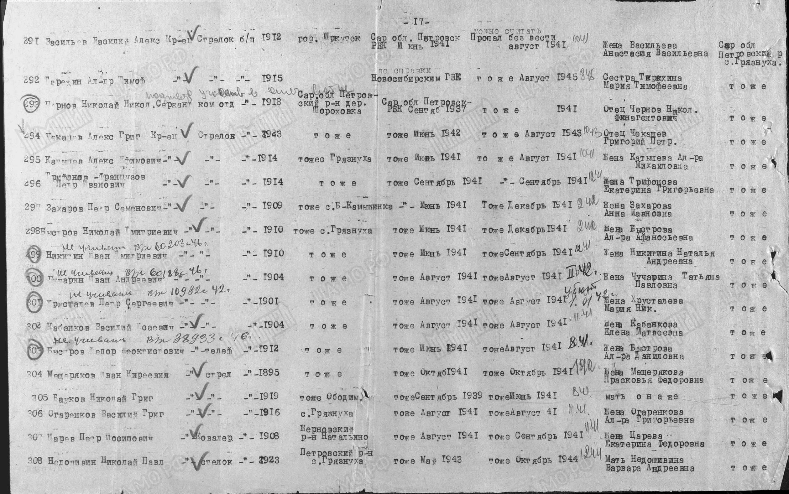 Добрый день! Моя 81 бабушка и вся наша семья долгие годы не можем узнать судьбу воина, отца 10-ых дочек, так и не вернувшегося с войны. Дата рождения: 1902 г.р, Место проживания:с. Телелюй Грязинский район Воронежская область Дата и место призыва: 03.04.1942 г. Грязинский РВК |